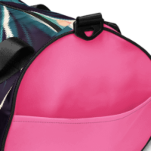 Ready to get your fitness on? Add some punch to pumping iron with this all-over print gym bag. Made from 100% polyester and sturdy, water-resistant fabric, this bag is fun meets function. And it’s got pockets!