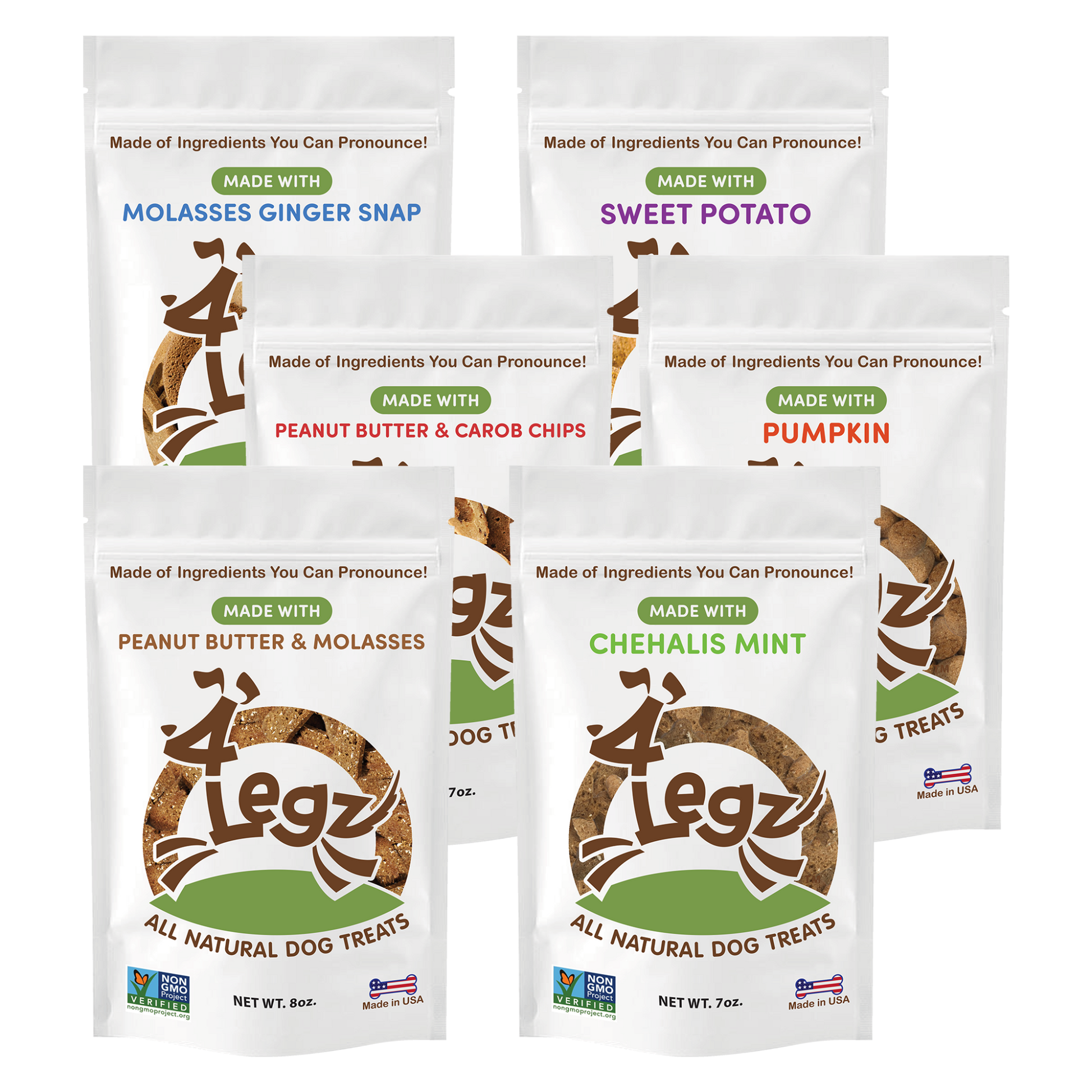 In this assorted bag of treats, you will get 6 of the 7 oz. pack your choice of treats. Choose from: -Molasses Ginger Snap "Dognutz" -Peanut Butter & Molasses "Kitty Roca" -Peanut Butter & Carob Chips "Ode to Odie" -Pumpkin -Sweet Potato -Chehalis Mint